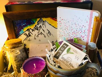 Each box will have 1 Green Tea Bag, 1 English Breakfast Tea, 1 Bedtime Tea, 1 Comforting Chamomile Tea (Eco-Friendly, Lead-Free, dishwasher Safe, Microwave Safe Mug) 4 Honey Sticks, 1 Handmade bar of Lavender Soap & Lavender Candle, Tree Journal & Hand painted Watercolor Pen Picture of a Mountain in a 5x7 frame. (Thich Nhat Hahn Saying).